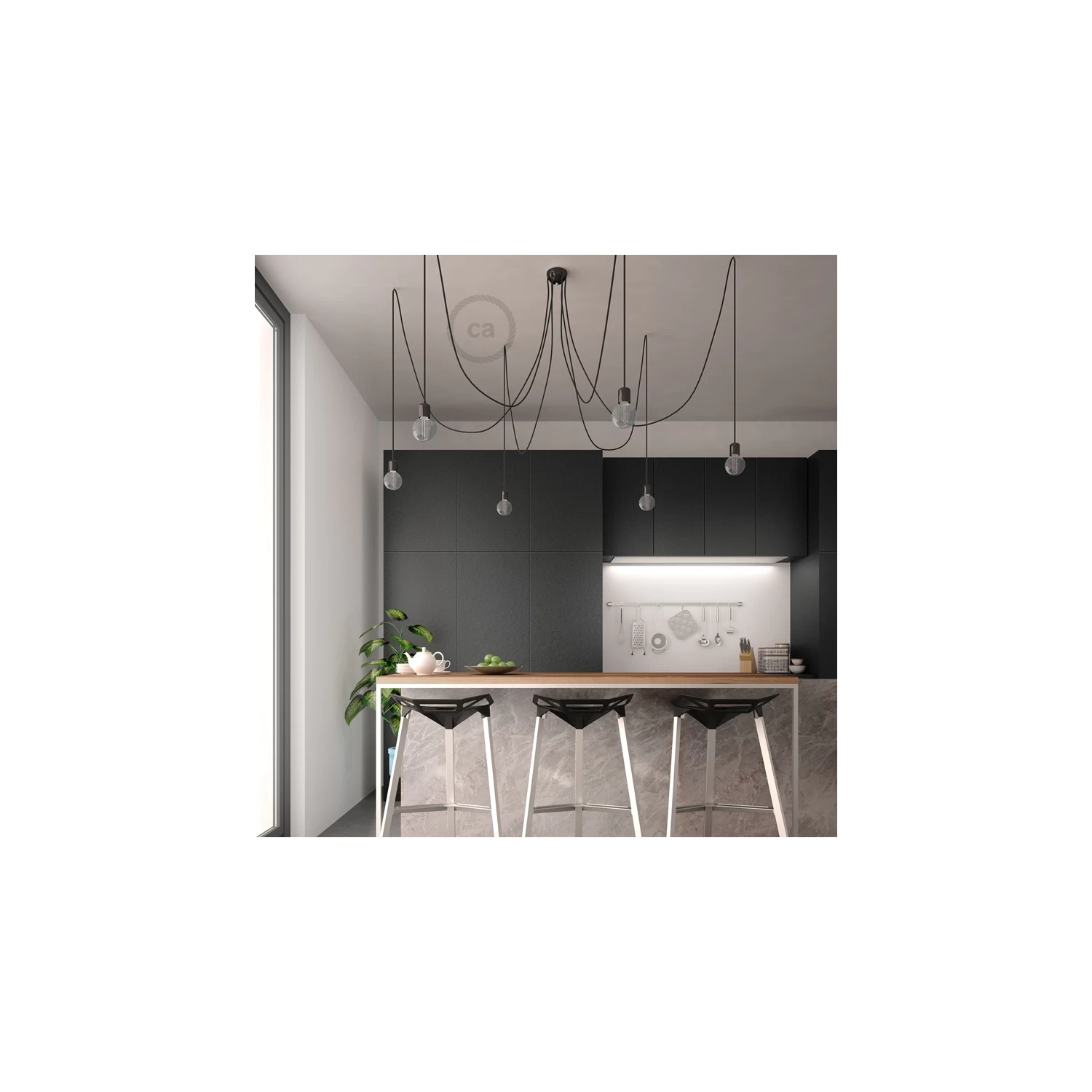 You can choose Black ceramic Spider with RM04 Black cable in the 6 or 7 pendants configuration: each one has a 13ft length making it perfect for any environment.