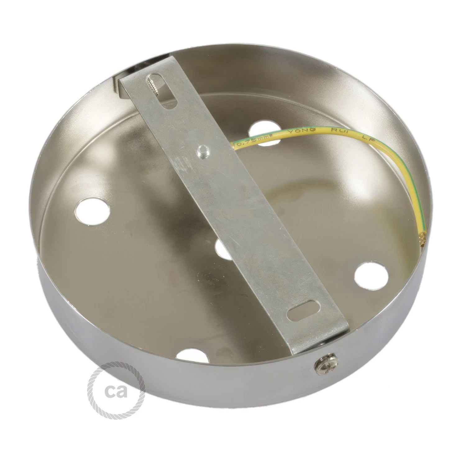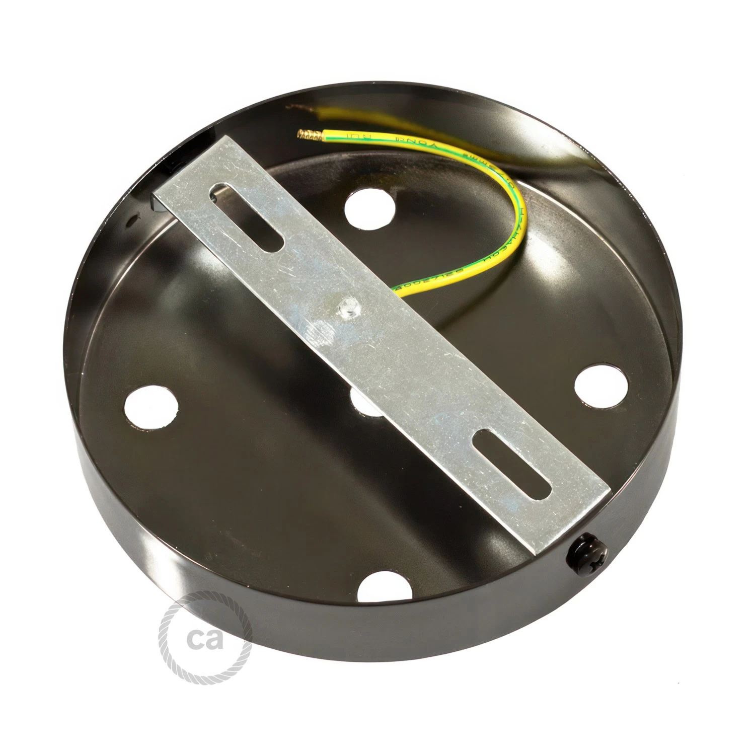 What’s in the box? This 5-hole ceiling canopy comes with: the canopy; a crossbar for attaching the ceiling canopy to the junction box, wall or ceiling; two screws for attaching to a wall; two screws for attaching the mounting plate to the sides of the ceiling canopy; and your choice of style strain reliefs. (If you choose the cylindrical strain relief option it will include the cable strain relief, a metal tube for connecting to the strain relief, a lock washer and a nut.)