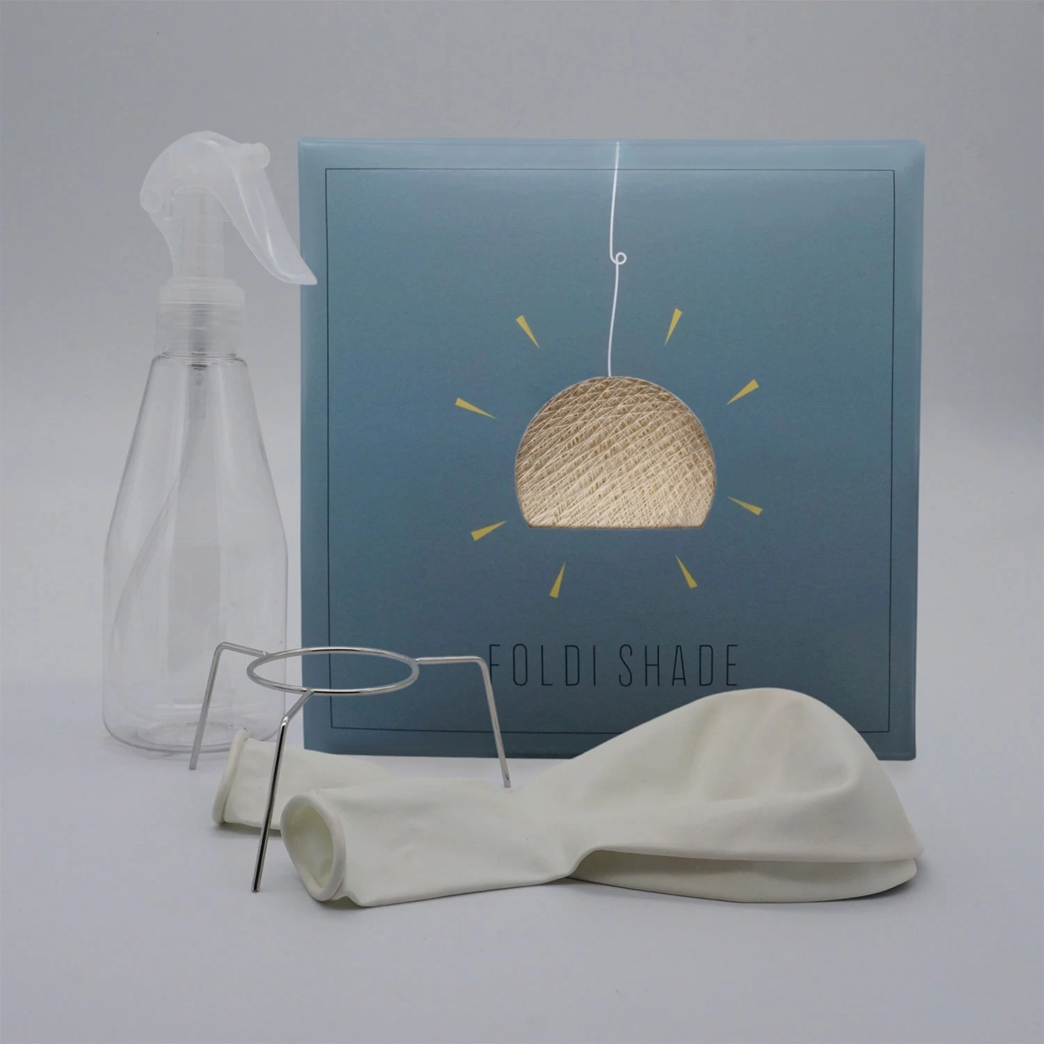 All of our dome Foldi Shades come folded in a beautiful box and include two balloons and a mounting piece so that you can hang it on your pendant light. It only takes a few moments to open the box, unfold the shade and place a balloon inside the shade and blow it up. After that you simply spray it down with water, tie it up and let it set for a few hours to harden.