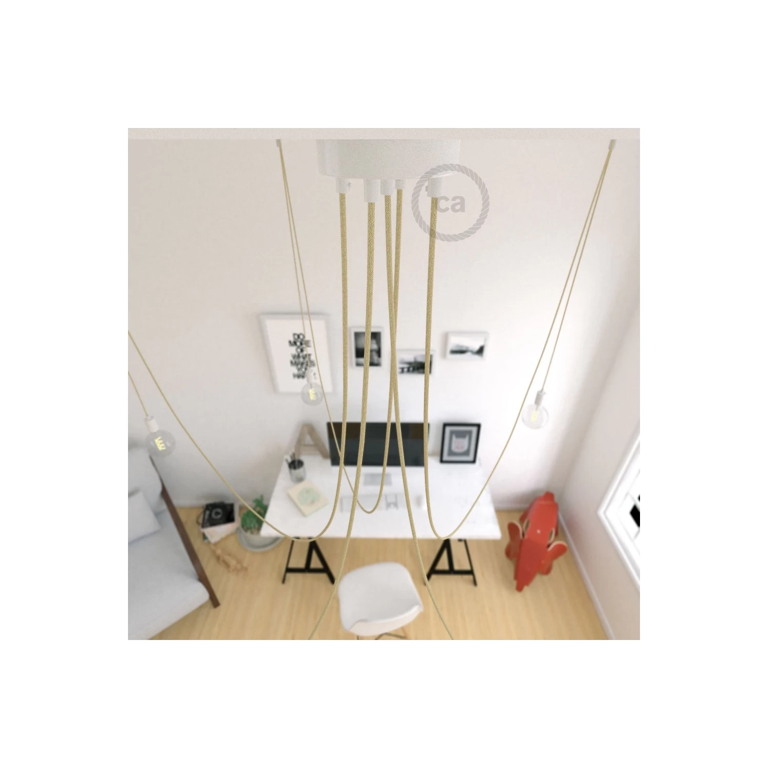 A spider of great charm, thanks to the unique finish of the cable: the Jute coating has a special color and sharpness that perfectly fit the glossy White of the components.