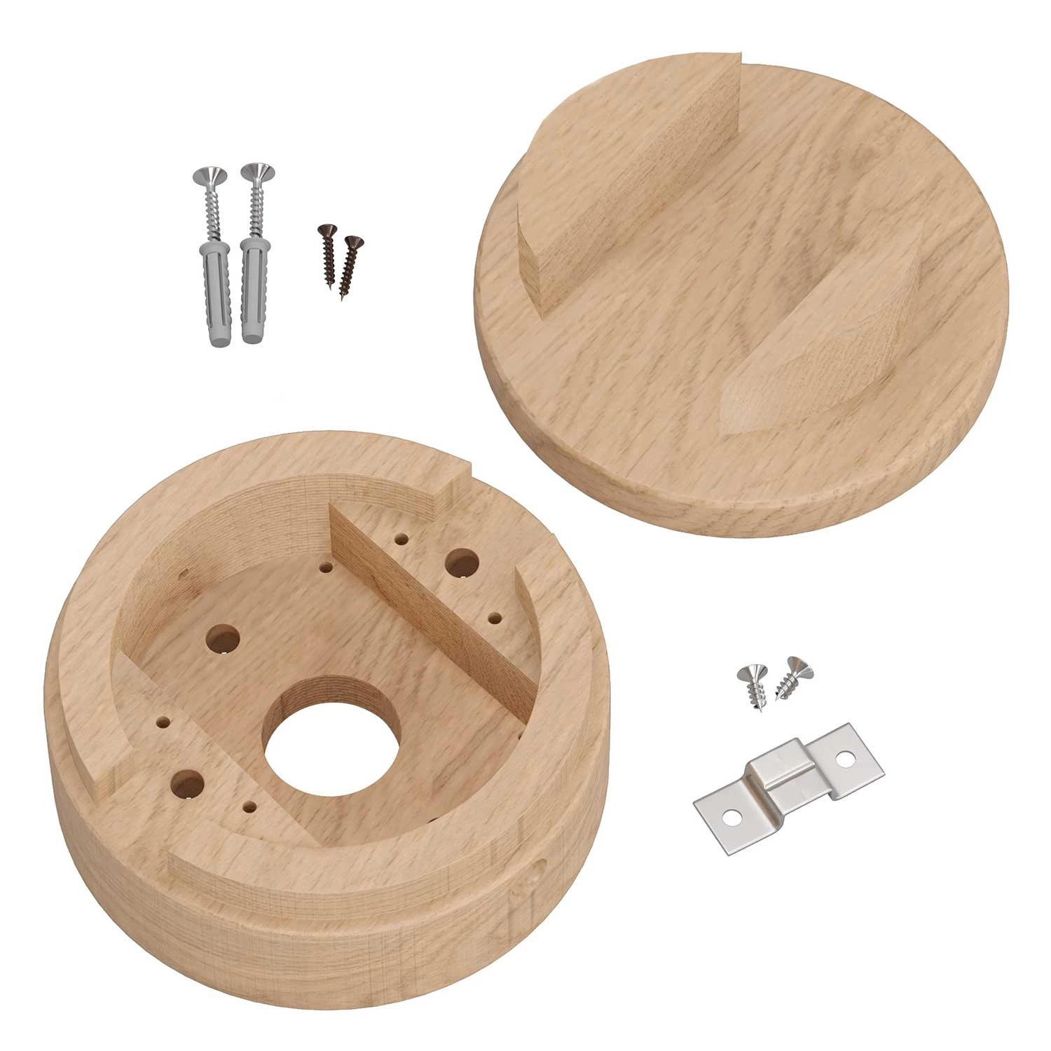 What’s in the box? Included is the two-piece 5″ diameter wooden canopy with 2 wood screws for attachment to your ceiling, 2 screws for attaching the two pieces of the canopy together, and a small metal fairlead, wooden dowel and 2 screws for blocking one hole of the canopy if needed.